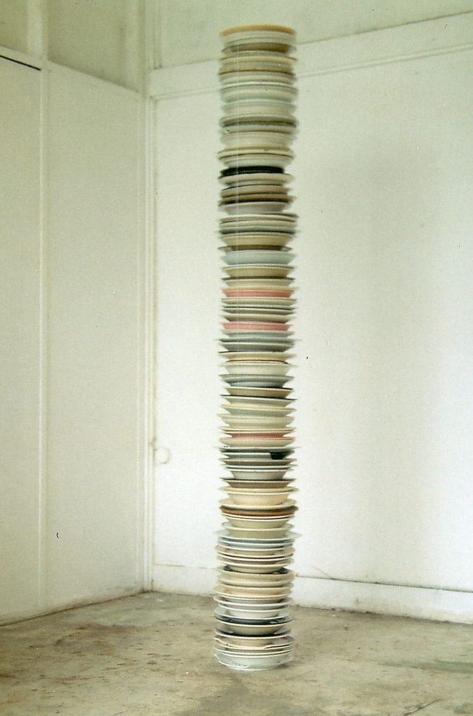 Equilibrium. Sculpture Materials: plates and nylon wire. Dimensions: 30cm x 30cm x 250cm