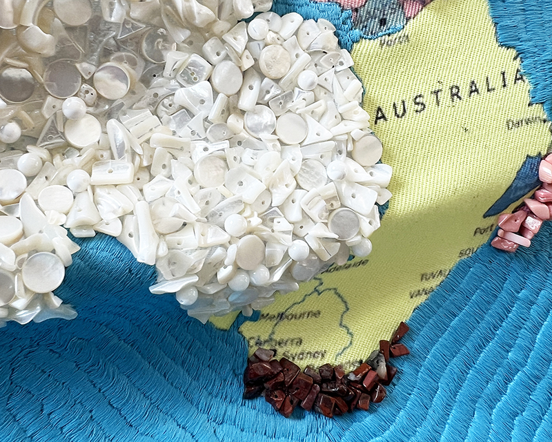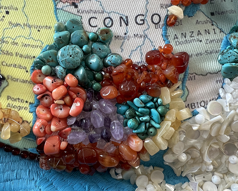 Pangea is an evolving, socially engaged artwork that takes the form of an embroidered map of the supercontinent. Oceans are stitched using threads made from recycled plastic, while the land is composed of gemstones, beads and other natural materials – bringing together elements shaped by both geological time and human extraction. The work reflects on the beauty of the earth’s materials and the complex histories of labour, desire, and exploitation embedded within them.